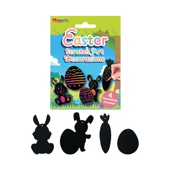 Easter Scratch Art Decorations 4pk. Easter themed scratch art decoration sets. Each one includes 4 fun decorations, ribbon to hang them and a wooden scratch tool. A fun Easter craft activity for kids.