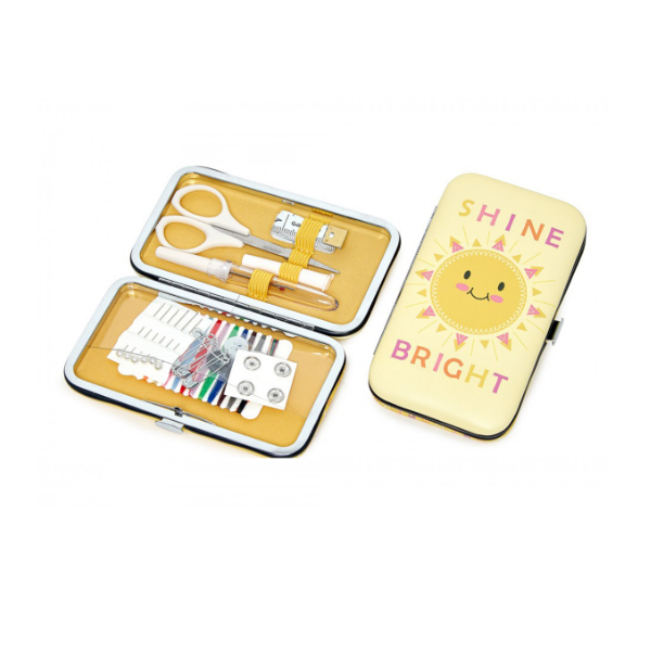 Faux Leather Sewing Kit Sine Bright. remium faux leather sewing kit in 3 bright and fun designs. Individually barcoded. Plastic free packaging Sewing kit dimensions: (d/w/h) 12 x 7.5 x 2.5cm. Sewing kit components: 9cm / 3.5in scissors x 1, 64cm/25in tape measure x 1, 100% polyester thread in 12 Colours, seam ripper x 1, needle threader x 1, snap fasteners x 4, shirt buttons x 4, hand needles x 3, head pins x 6, safety pins x 6. CDU dimensions: (d/w/h) 23 x 20 x 12.5cm.