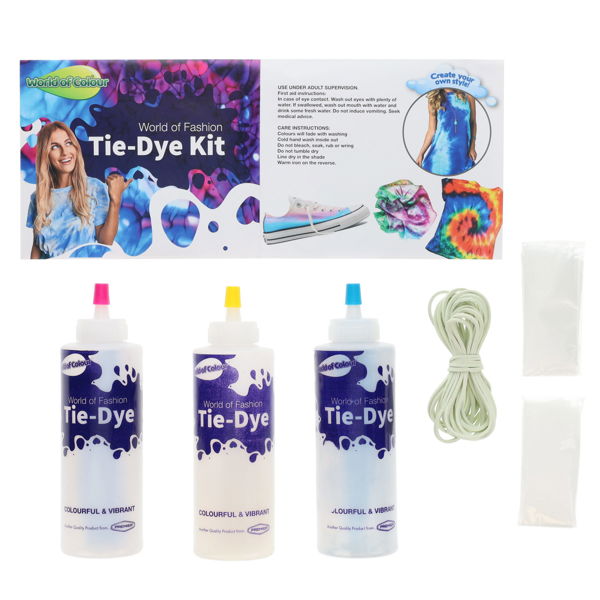 Tie Dye Kit Fuschia Yellow and Turquoise is a fantastic kit to add your own creativity to your clothes all you need to do is add water, twist into shape, wrap with bands and add your dye.