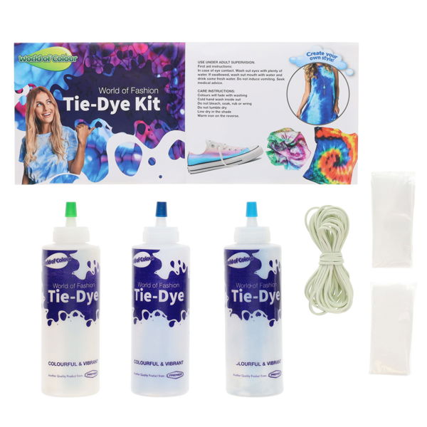 Tie Dye Kit Turquoise Green and Blue is a fantastic kit to add your own creativity to your clothes all you need to do is add water, twist into shape, wrap with bands and add your dye.